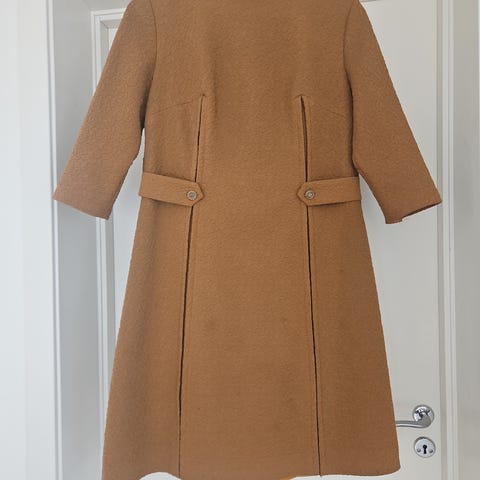 Lekker 60-talls kjole. Ingen tag. Blankt stoff, trolig polyester. Glidelås bak. Stoffklaffer bak som kan knytes som en sløyfe, se bilder. Innsvinget. Pent brukt. Størrelse ca M, se mål. Lengde fra overkant skulder til skjørtekant ca 95 cm. Omkrets under armer ca 90 cm, liv ca 80 cm. Se også mine øvrige annonser (trykk på min profil for å se annonsene).