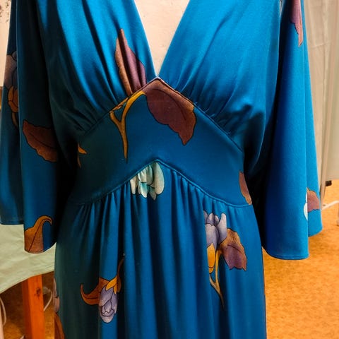 Lekker lang sjøgrønn kjole. Ingen tag. Meget pen. Ikke foret. Glidelås bak. Lommer. Størrelse ca L, se mål. Trolig polyester. Stoffbelte. Lengde fra overkant skulder til skjørtekant ca 140 cm. Omkrets under armer ca 95 cm, liv ca 85 cm. Billigste porto. Se også mine øvrige annonser (trykk på linken for å se annonsene).