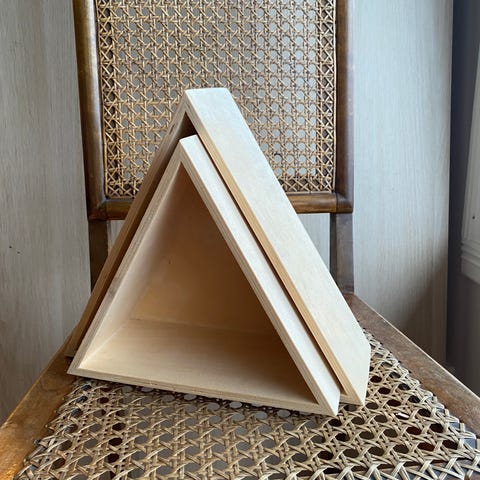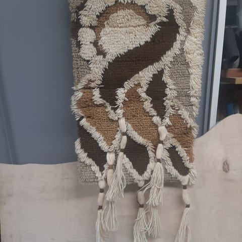 Tre hylle med oppbevaringsrom i naturlig trefarge. Mål: 109 cm i lengde og 44 cm i bredde. Har flere rom for oppbevaring og dekorative utskjæringer på fronten.