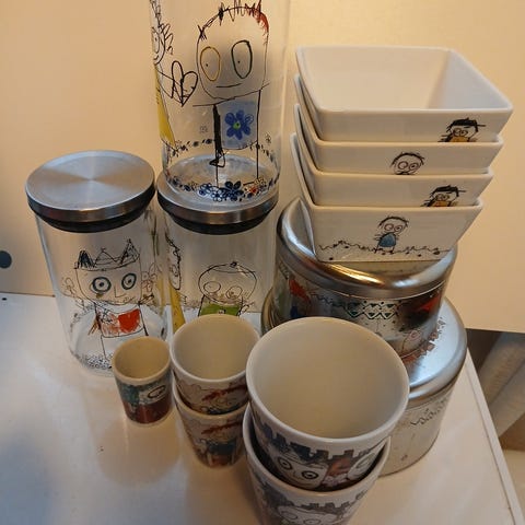 Kopper i porselen med fargerike tegninger.