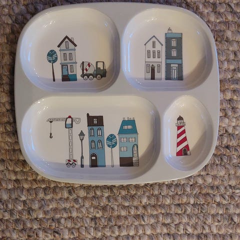 Selger pent brukte barnefat/ barnetallerken fra Sebra og Rice.