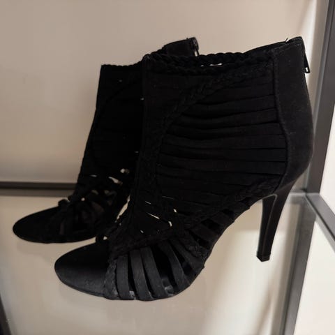 Åpen tå og med snøring foran som feste. Mørk blå/ svart i fargen.