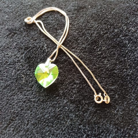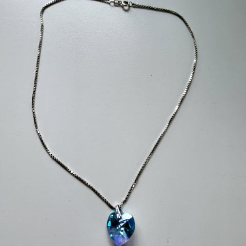 Blågrønn glitrende ( vanskelig å få frem på bildet) farge. Stempel 925 sølv. Har aldri vært brukt men kjedet har blitt litt misfarget etter å ha ligget lenge i et smykkeskrin. Anhenget er like fint.