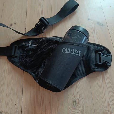 Det er justerbart, sitter godt pga gummi på innsiden av beltet, har en liten lomme til mat o.l., samt plass til 2 flasker på 250ml hver.