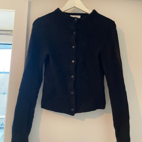 Kjempesøt jakke, topp, til dame. Fra Glamouros Petit, str 34. Ribbestrikket, litt strechy materiale. Lappen inni med beskrivelse av materiale er dessverre klippet bort. Pent og lite brukt. Helt sort i stoffet, men vanskelig å få frem på alle bildene. Ingen flekker, hull eller skader. Selges da den er for liten.
