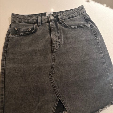 Svart dongeriskjørt. Merket og str er klippet av. Skjørtet føles som en str S. Hentes i Drammen eller sendes i posten