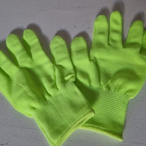 Jeg ser at det har sittet en oginal klistrelapp på de grønne fingervantene, som kanskje går av i vask.