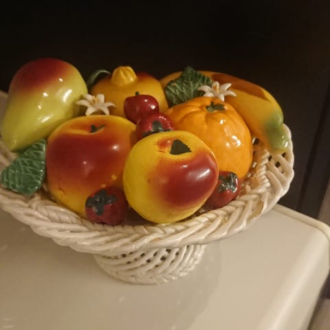 Fruktfat i blå, gul, grønn keramikk. Ca 27 cm i diameter og ca 5 cm høy.
