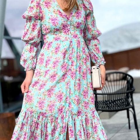 Kjolen er laget av bærekraftig viskose i georgette kvalitet. Kjolen har korte voluminøse ermer, volangdetaljer på ermene og skjørtet. Den kommer med belte i midjen som gir en feminin passform.