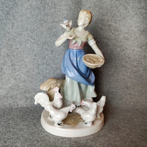 Nydelig sjelden Porselens figur av jente som mater fuglene.