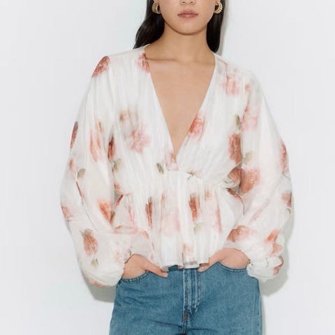 Rosegull / rosa off the shoulder bluse i sateng fra Gina tricot i str L