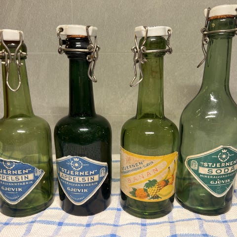 Flott stand, ingen skader som jeg kan se, kun noe naturlig aldersmessig slitasje. Flotte håndmalte etiketter, fasetterte flasker og veldig pene slipte fasetterte stoppere. Tipper disse er fra slutten av 1800 tallet til begynnelsen av 1900. På etikettene står det: "AQVA MENTH.PIP.", "JODOFORM." og "NATRII DIAE THYLBARBITUR." Kjempefine dekorative flasker som passer kjempefint til pynt på et kjøkken eller ammelt bad. Fine å ha feks. badesalt eller andre ting i.