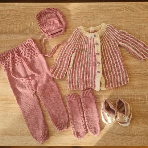 Selger ett stk Go'klompen-sett fra Klompelompe, str 0-3 mnd, bestående av jakke, bukse, to stk luer, votter og spiralsokker.