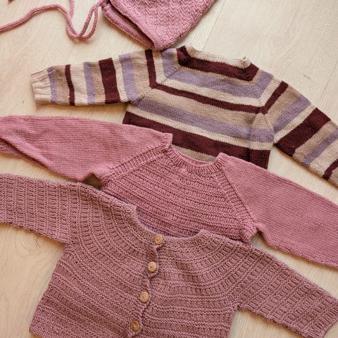 Strikket i drops baby merino farge 34- lyng og farge 02- natur.