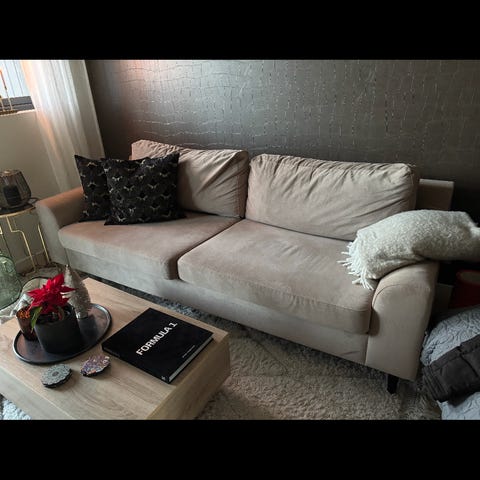 Sofa kjøpt ny i 2022, lite brukt og fremstår som ny. Veldig god å sitte i. Den har rette og fine linjer samt høge bein som gjer att denne passer fint inn i både små og store rom. Gråfargen er nøytral og glir fint inn med andre farger.