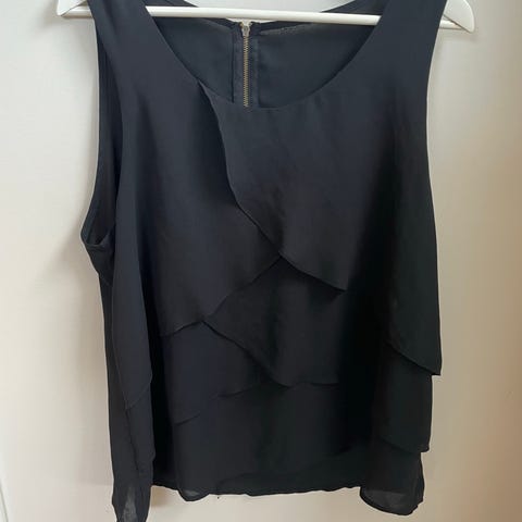Svart, ermeløs, bluse, singlet med trykkknapper på skuldrene. Split fabric, nederste del er gjennomsiktig mesh. 100% viskose øverst. 100% polyester nederst.
