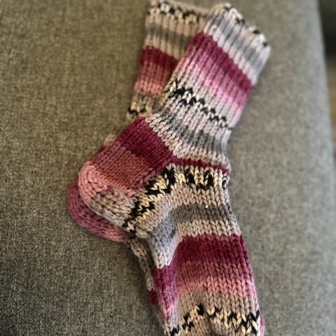 Rosa og lilla raggsokker i ca str 38. Håndstrikket av min venninne, selges på vegne av henne for å hjelpe henne økonomisk. Flott for de som fryser på beina 💜