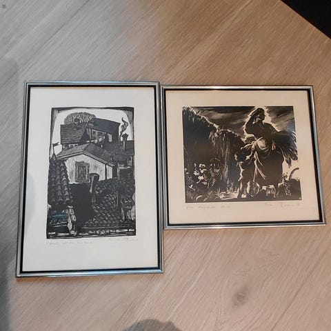 2 STK BILDER MED GLASS OG RAMME SELGES SAMLET ELLER DELT. BREDDE =66 CM H = 81 CM 200 KR STK ...SENDES IKKE ..HENTES RØYKSUND KARMØY KOMMUNE