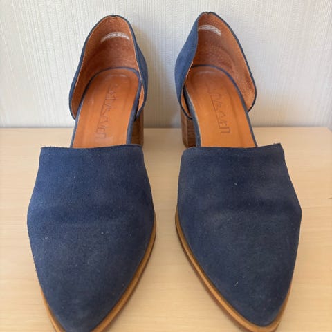 Fra Sixtyseven. Blå høyhælte sko str. 38. Store i størrelse, passer bedre 38,5/39. Kan gjerne prøves.