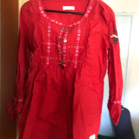Rød, paisleymønstret blusetunika med vide, bellesleeves med splitt og deep plunge v-utringning med hemper. Avvikende farge/mønster på ermer rygg/bryst. Splitt i sidene. 57% lyocell, 43% modal