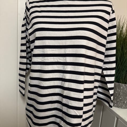 Tynn, stripete, langermet, t-skjorte med båthals. Tynne striper + tykkere striper. 100% tencel.