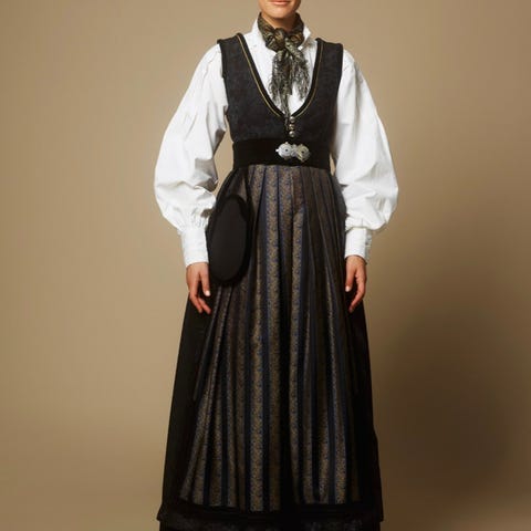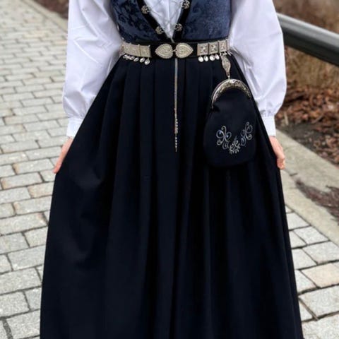 STØRRELSE: Jeg er 1.74 høy og bruker vanligvis S/36 i overdel, M i underdel. Denne har passet meg siden jeg var konfirmant og har ulike hakk på stakk, belte og forkle, så kan passe fra S til M!:)