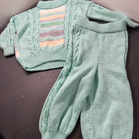 Hjemmestrikka sett med bukse, jakke og lue i str 80 strikka i tynn merinoull i støv lilla farve :)