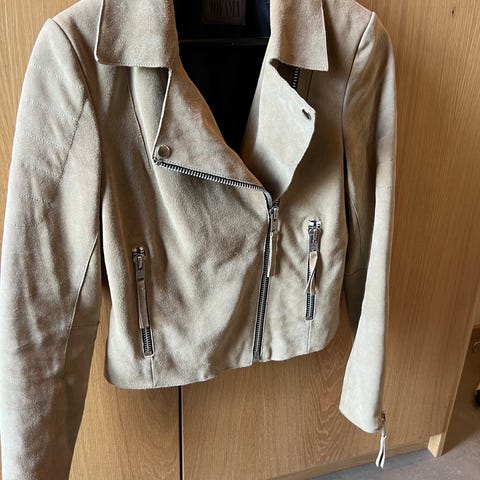 Nesten ikke brukt. Biker jakke i imitert semsket skinn. Ser helt fin ut. Kjøpt på Nelly .