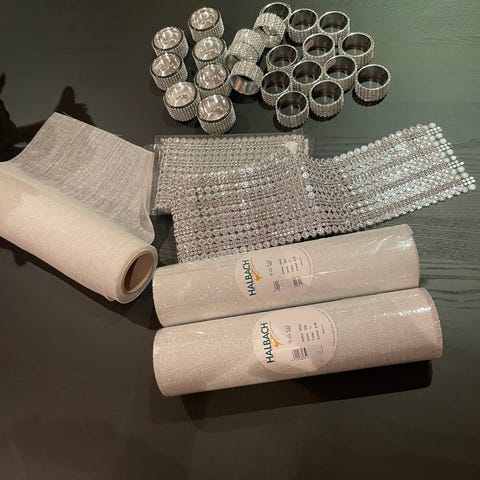 Ubrukt kakepynt/kaketopper mr&mrs i gull og tre til bryllupskake og girlander "just married" i jute selges, 100 kr.
