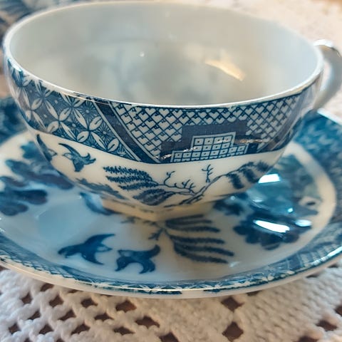 Selger 2 sett frokostkopp med skål i stentøy fra Engelske Churchill fabrikker. Klassisk blå/hvitt motiv. Koppen er romslig og kan brukes som både te-og kaffekopp. Dia 9 cm, h 6,5 cm. Skål dia 14 cm. Hele, pene, ingen skader, fremstår som nye. Pris kr 75,-pr sett. Hentes i Oslo eller sending etter avtale.
