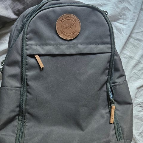 Grønn beckmann skolesekk selges. Kr 300. Kan sendes mot porto. Brukt 2-3 klasse. Følger med regntrekk. Trenger en vaske, eller helt og pen :)