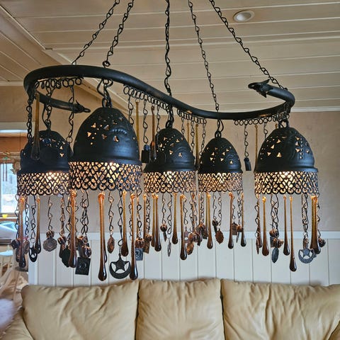 Meget flott unik munnblåst kunstglass rav farget kuppellampe. Glasset er tilsatt soda. Slik at det blir bobler i glasset. Laget pene mønster inni lampen som gir meget vakert lys. Lengde glass kuppel 25 cm. Diameter bunn ca 21 cm, diameter topp 15,5 cm i dm. Lengde med messing kant ca 28 cm. Lengde til krok oppheng ca 56 cm