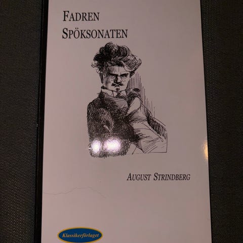 Selger en bok med de to verkene Fadren og Spöksonanten av August Strindberg.