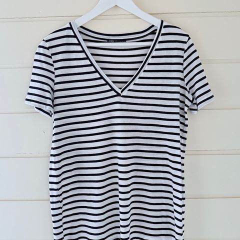 Kortermet topp fra KappAhl str 36/38 i stripete blandet stoff 95# bomull, 5% elastan. Lengde ca 48 cm, bredde mellom ermene ca 40 cm. Stretch