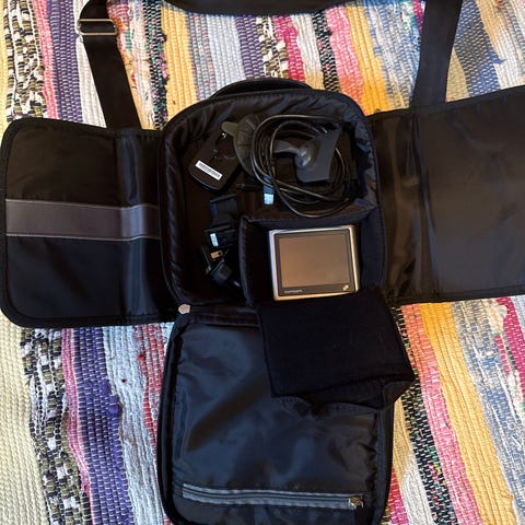 TomTom GO 6000 GPS. Navigator med fargeskjerm og kartvisning. Enheten har en port for tilkobling og er designet for navigasjon i bil.
