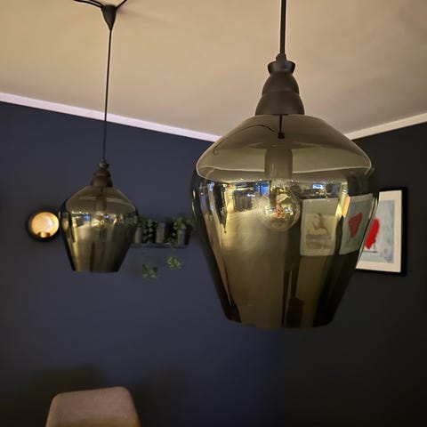Gul metallic pendellamper (den rosa er solgt). Ca 25 i diameter. 60w pære, E27 sokkel.