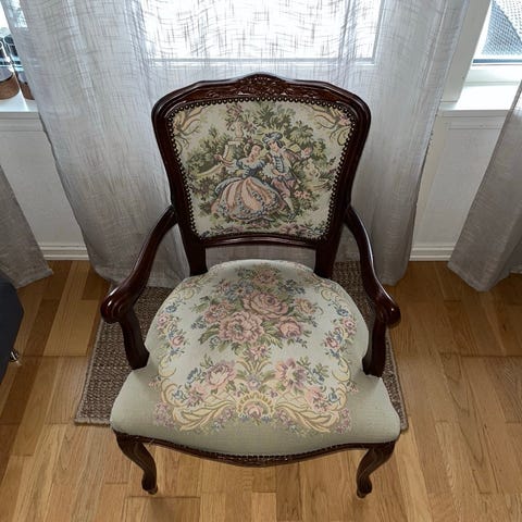 Begge stolene har vært pent brukt og stort sett stått til pynt, og har ikke vært sittet i så mye siden anskaffelsen, har noen få bruksmerker ellers lite eller ingen slitasje i stoffet.