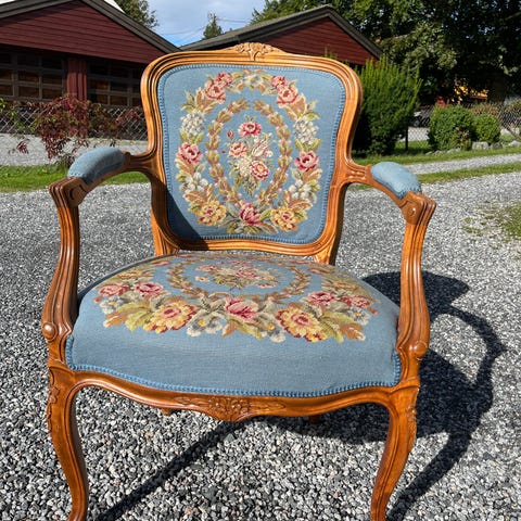 Franske rokokko armstoler i relativt god stand. Trukket om i 2018 i eksklusivt stoff.