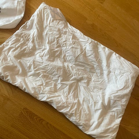 Pent brukt. Dynetrekket er 85x75 cm ca. Noen svarte streker på nedre del av dynetrekket på fremsiden. Se bilder.