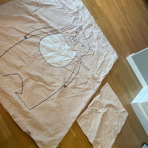 Dynetrekket er ca 90x75 cm. Putetrekket er ca 35x30 cm