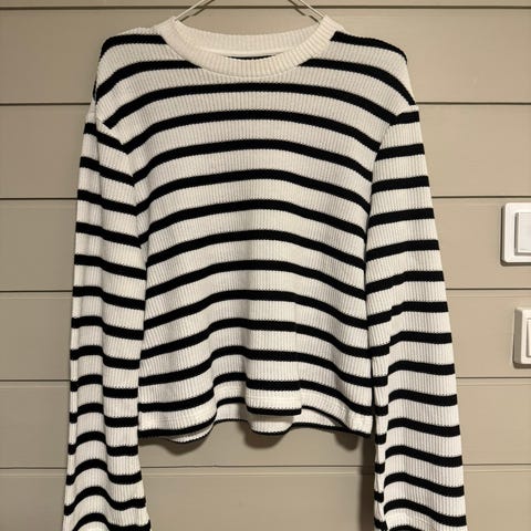 Stripete cropped genser fra Zara. Svart og hvit. Nesten ubrukt. Det er en str L men kan fint brukes av mindre størrelser om man ønsker den litt oversized - jeg bruker selv S.