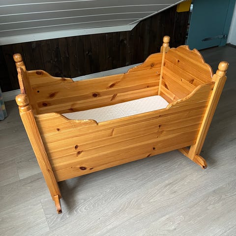 Selger vuggen vår da vi ikke har mer brukt for den. Håndlaget ..