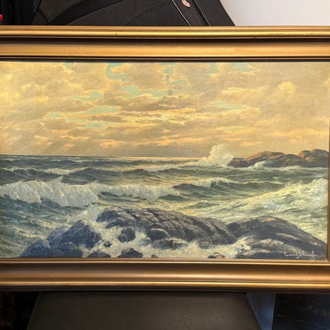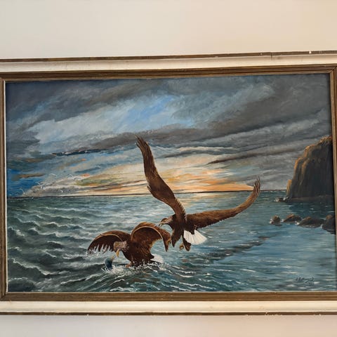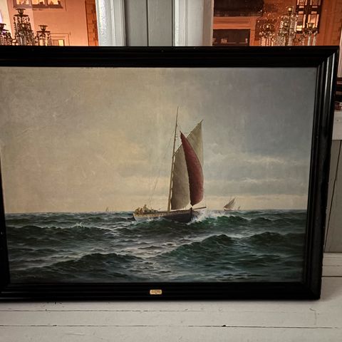 Carl Höjrup (b.1893-d.1961) dansk maler, ærfugl flyr over havet med høye bølger. Olje på lerret 139 x 101 nyrenset og med ny ramme. Sign. C. Høyrup - 48.