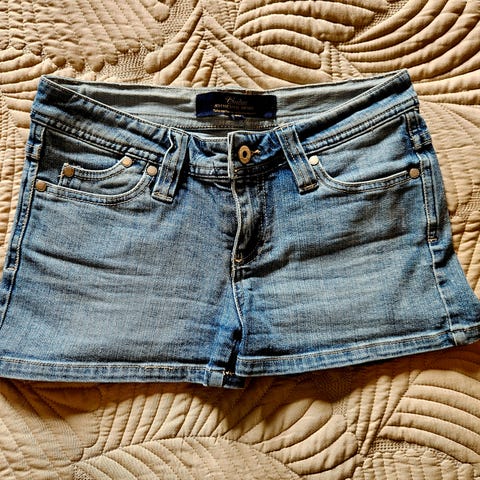 Jeans shorts med høyt liv i str S fra Pieces. Stretch, glidelås/lommer bak og sitter veldig pent over rompa. Selges kr 45,-