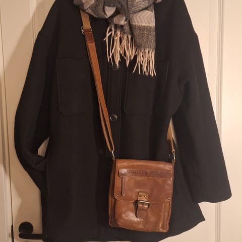 Sort kort kåpe som passer både vinter, vår og høst. Den er fin til både bukse og skjørt. Den er innsvinget i livet. Jakken har gode stikklommer, og flere fine detaljer. Legg merk til at kåpen kan kneppes på to ulike måter. Jakken kan være åpen i halsen - og får en V-åpning som passer godt om man har et stort skjerf eller en høyhalset genser innenfor, eller man kan kneppe helt igjen slik at skjerf blir overflødig. Jakken er så godt som ubrukt.