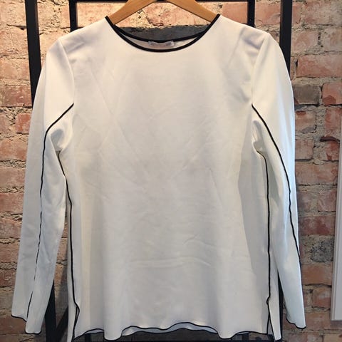 Lys hvit topp med blomster på med blondekant rundt halsen og ermene. Pen overdel. Litt stor i størrelsen så passer fint til en som bruker str L også. Den har strikk i linningen, som usynliggjør mage.