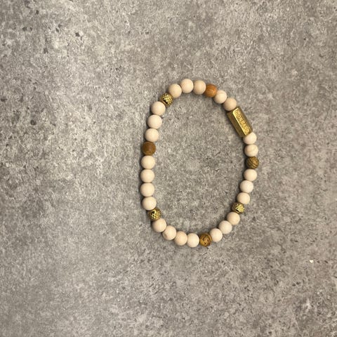 Armbånd selges. Glass-, akryl og metallperler tredd på solid silikontråd.