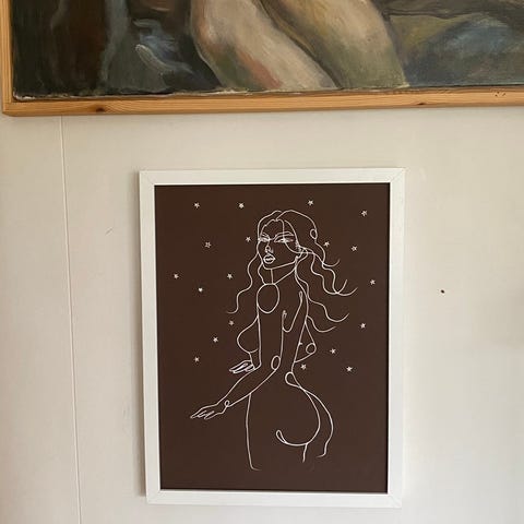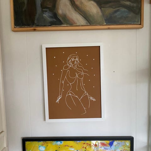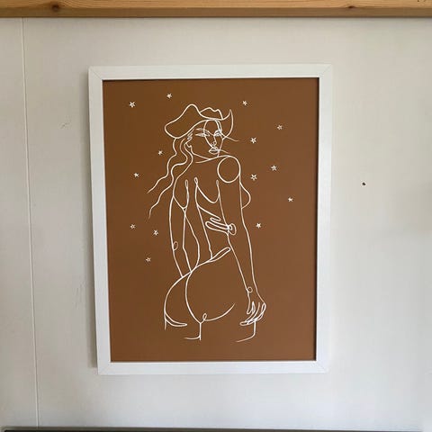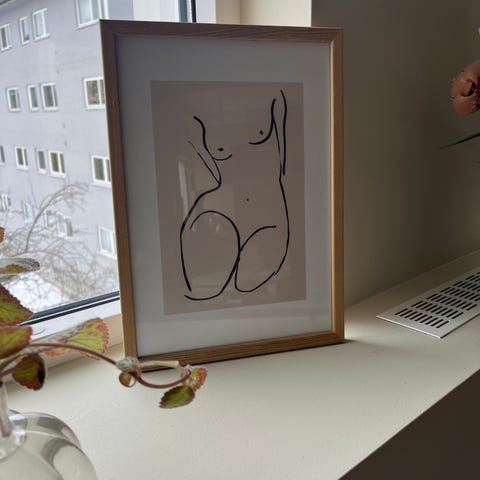 Følger med ramme med plastikk, ble tatt av for å få bilde av trykket.