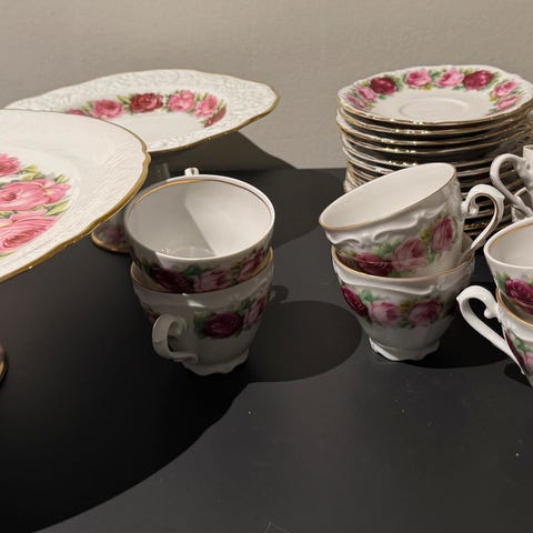 6 kopper med tefat, kaffekanne, sukkerskål og fløtemugge til salgs. Fremstår som nytt, har stått i skap til pynt.