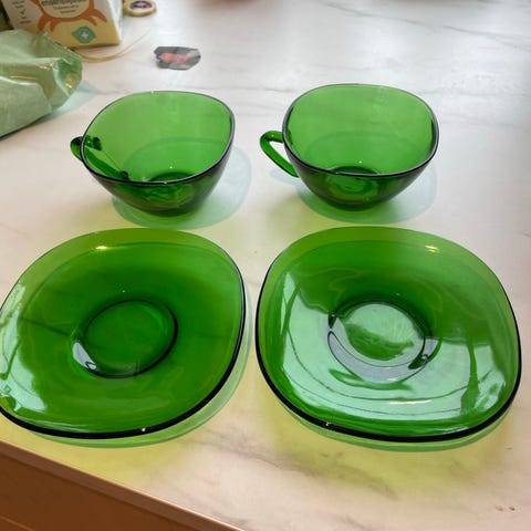 To kopper med hank i glass med motiv av grønnsaker. Pressglass.